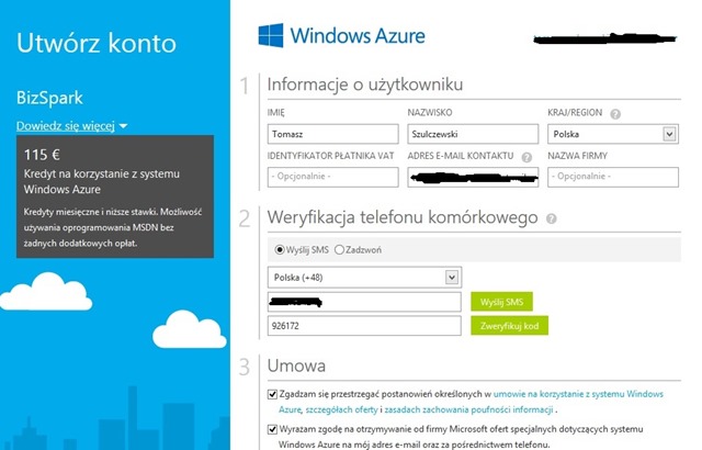 Zostaniemy przeniesieni na stronę rejestracji do Windows Azure, gdzie nasze dane już są, a jedynie musimy się uwierzytelnić za pomocą naszego telefonu.